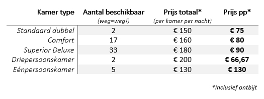 Er zijn dus maar een beperkt aantal kamers gereserveerd, dus wie het eerst komt.... Bovenstaande aantallen worden niet geüpdate op deze pagina (van het hotel krijgen jullie te horen of het gewenste kamertype nog beschikbaar is). Bij de prijs is ook ontbijt (per persoon) inbegrepen.